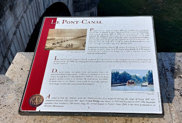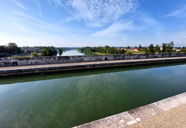 | Le pont-canal d'Agen, bâti entre 1839 et 1847 sous la direction de l'architecte Jean-Baptiste de Baudre, 539 m de long et 12,50 m de large, permet de faire passer la navigation au-dessus de la Garonne. |