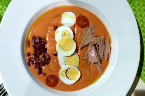 | La "porra", soupe froide typique d'Antequera (tomates, mie de pain, huile, sel, thon ou jambon cru, oeufs...) |