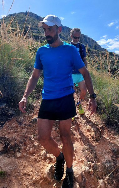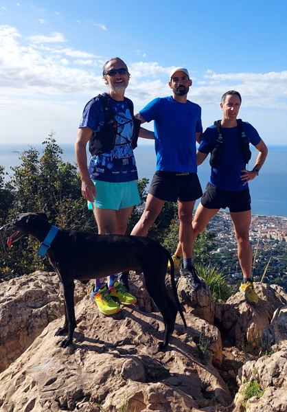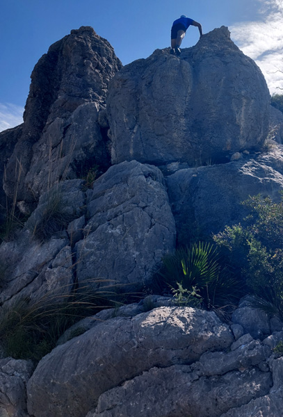 | Dimanche 3 mai 2025, 9h, 28°C Double ascension du Mont San Antón (491 m) par la face Est puis Sud avec Dani et Nico. Sonic, Luna et Troya, les 3 fidèles compagnons de Nico. |