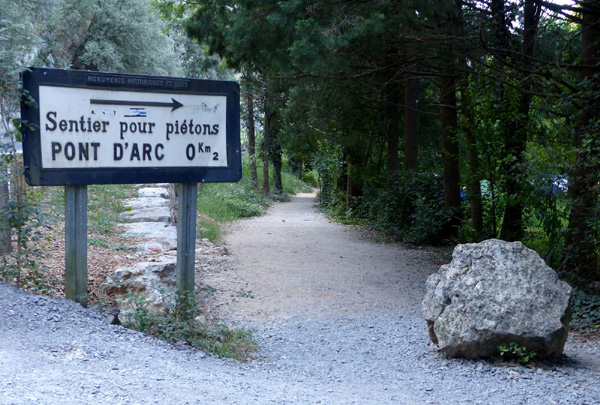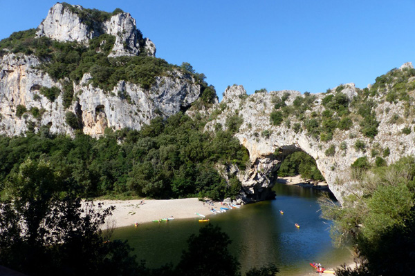 | Le Pont d'Arc, creusé par la rivière il y a 400 000 ans est l'emblème des Gorges. Cette arche naturelle affiche des dimensions colossales : 54 m de haut pour 59 m de large. L'Ardèche, qui contournait jadis l'endroit en un large méandre, a, dans l'optique d'emprunter le chemin le plus court, percé la falaise et creusé la falaise pendant des millénaires. |