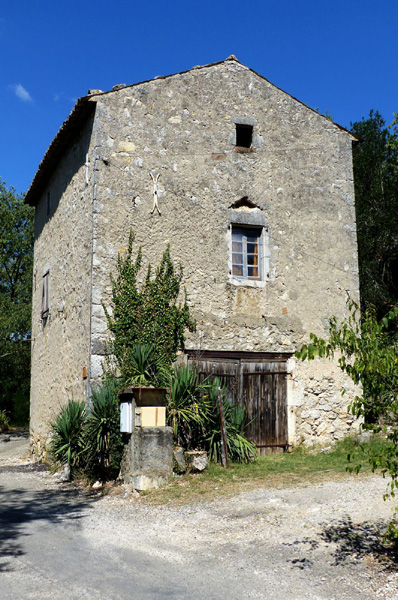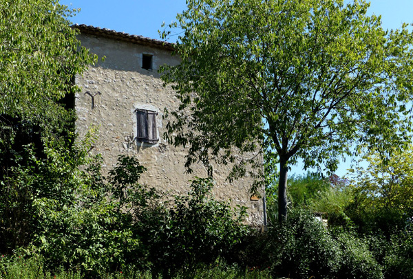 | Façade occidentale de l'église qui se présente comme un mur nu percé d'une simple fenêtre, prolongé par le clocher-arcade dont les trois baies sont dépourvues de cloches depuis que celles-ci ont été transportées dans la nouvelle église du village |