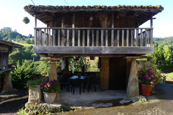 | "Hórreo", grenier typique du nord-ouest de la péninsule Ibérique (principalement Galice et Asturies en Espagne, et région Nord au Portugal), construit en bois et pierre, et élevé sur des piliers terminés par des supports plats afin d'en interdire l'accès aux rongeurs. |