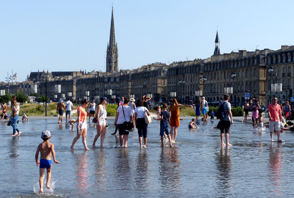 | Le Miroir d'eau de Bordeaux, 2 cm d'eau sur une gigantesque dalle de granit reflétant la place de la Bourse et les quais de Bordeaux. En fonctionnement depuis 2006, le miroir présente une superficie de 3450 m², ce qui en fait le plus grand du monde. |