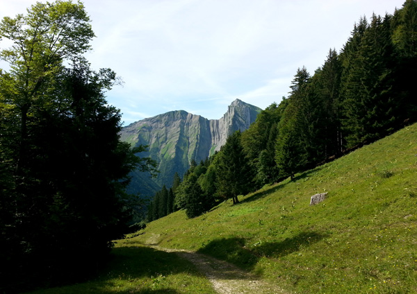 | Falaise de la Pointe d'Arcalod dont le sommet se dresse 450 m plus haut. L'ascension emprunte deux grandes failles inclinées séparées par des passages en traversée, techniquement de difficulté moyenne à condition d'être familiarisé avec le vide et de posséder quelques notions d'escalade... |