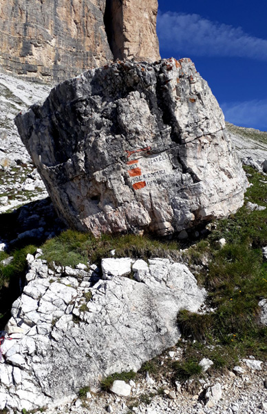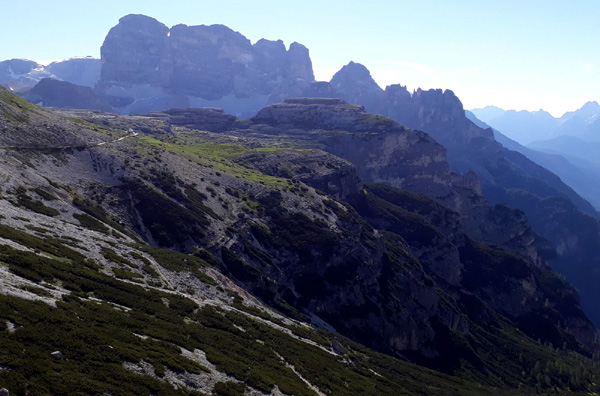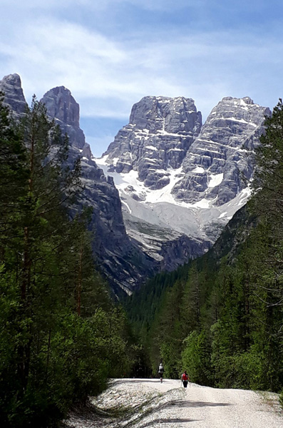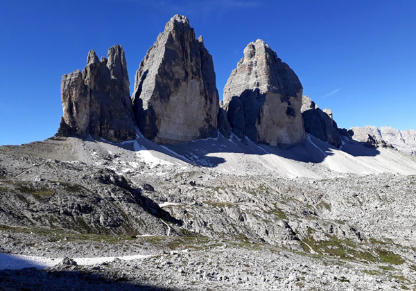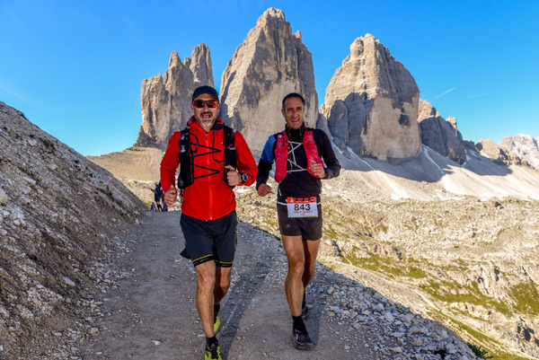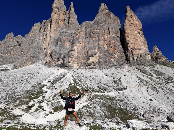 | KM 52 : derrière nous, les "Tre Cime di Lavaredo", sommets emblématiques des Dolomites, composés de la "Cima Grande" (2999 m), la plus élevée, la "Cima Ovest" (2973 m) et la "Cima Piccola" (2857 m) |