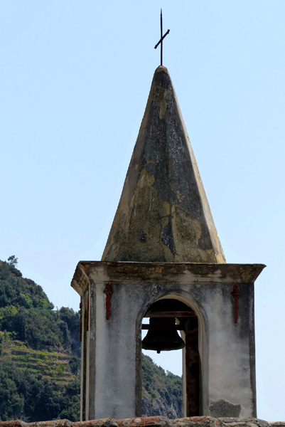 | Basilique de San Giovanni Battista, en haut du centre historique de Riomaggiore. Elle fut construite en 1340 par les maîtres Antelami à la demande de l'évêque du diocèse de Luni, Antonio Fieschi. A la suite d'un éboulement, l'église fut complètement reconstruite en 1870-1871. |