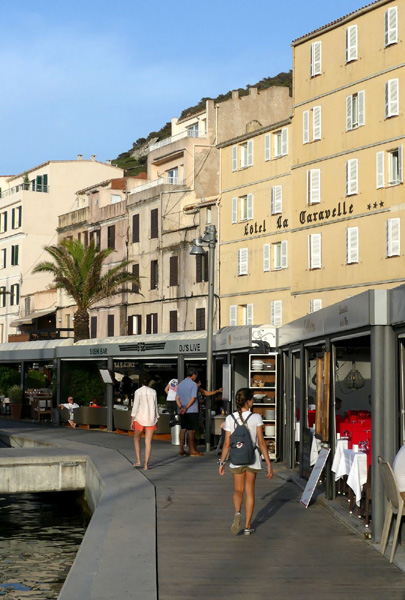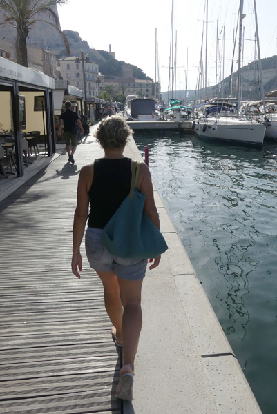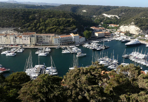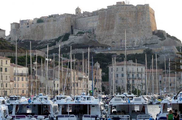 | Le port et, en arrière-plan, la haute-ville et la citadelle. La citadelle de Bonifacio est un ouvrage militaire bâti progressivement à partir du 12ème siècle pour permettre la protection de Bonifacio qui est alors une place importante de la République de Gênes et assurer la sécurité du commerce entre Gênes, la Ligurie et la Sardaigne. |