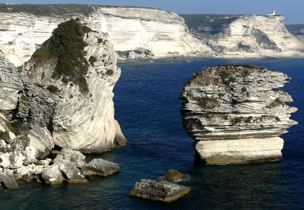 | "Le Grain de sable", l'un des attraits touristiques de Bonifacio. Il s'agit d'un stack : éperon détaché du littoral par l'érosion. |