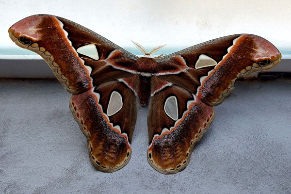 | "Attacus Atlas", papillon de nuit géant d'une envergure moyenne de 26 cm. Ce papillon imite parfaitement 2 têtes de serpent de profil, magnifiques trompe-l'oeil destinés à faire fuir ses prédateurs. Il est surnommé, à juste titre, le "papillon cobra". |