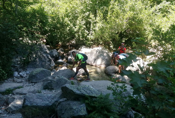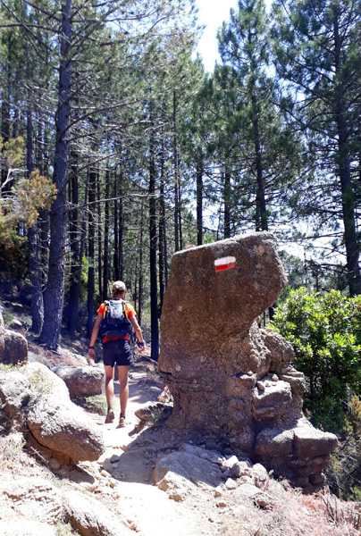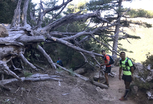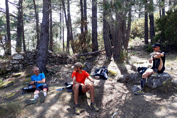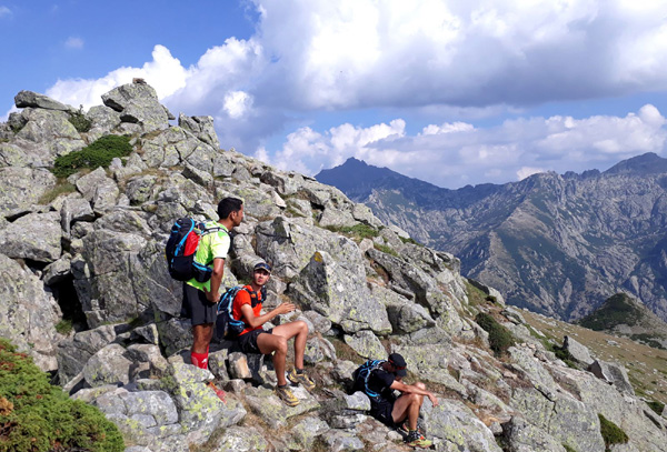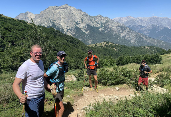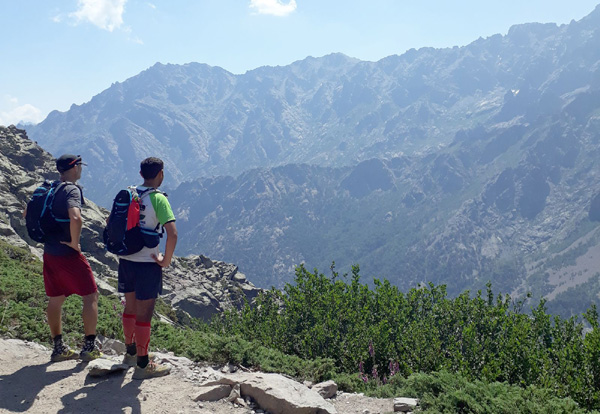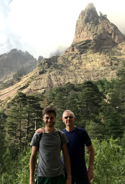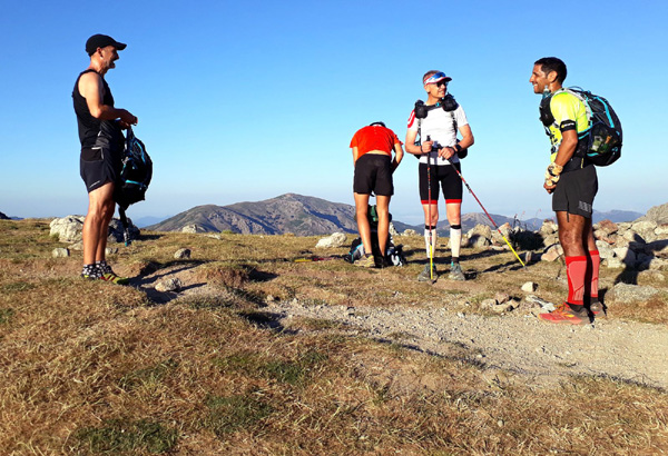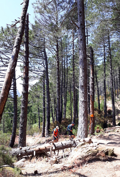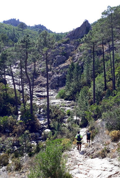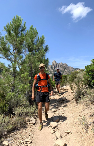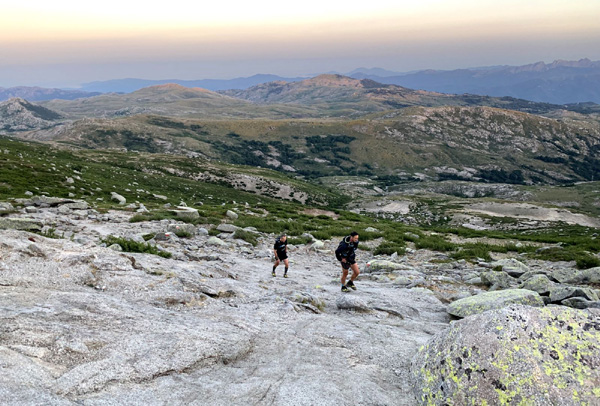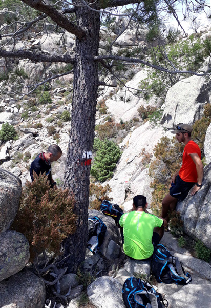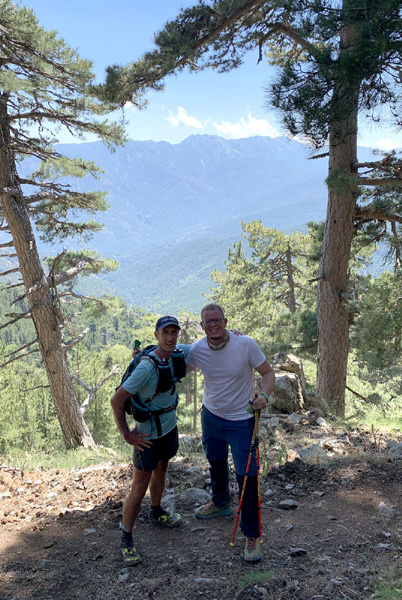 | Mardi 2 juillet, 5h30 : Antoine, trailer de 19 ans super performant sur les marathons de montagne, et son père Laurent, ancien légionnaire et sportif confirmé, quittent le village de Calenzana. Nicolas, M'hamed et moi les rejoindront le mercredi 3 juillet au soir à Castel Di Vergio, Antoine et Laurent ayant préféré réaliser notre 1ère étape en 2 jours. |