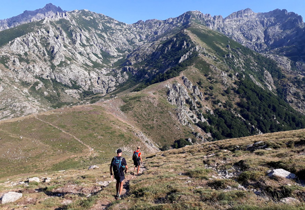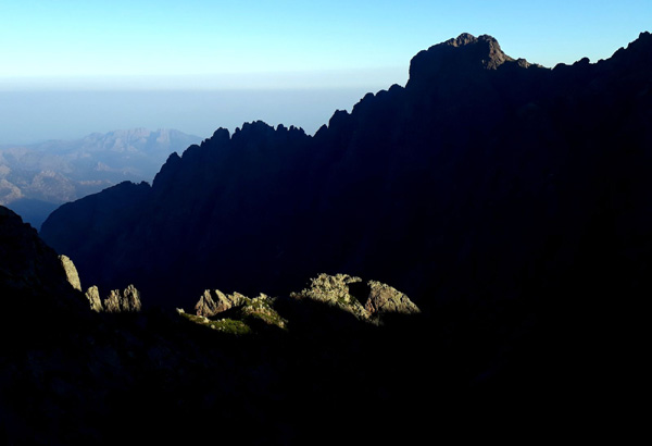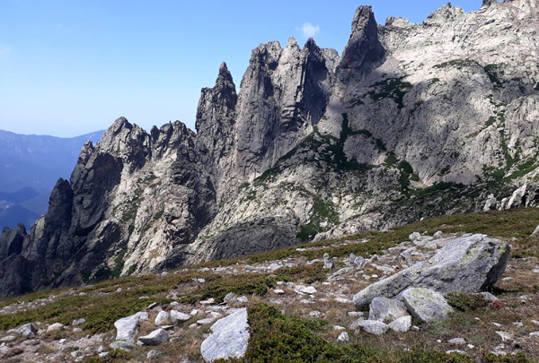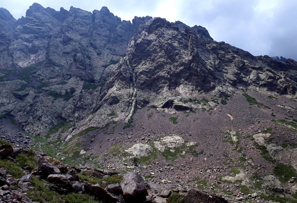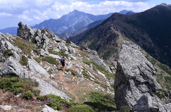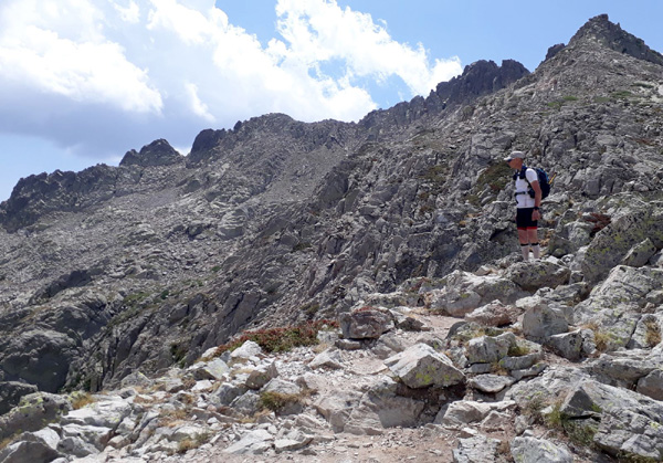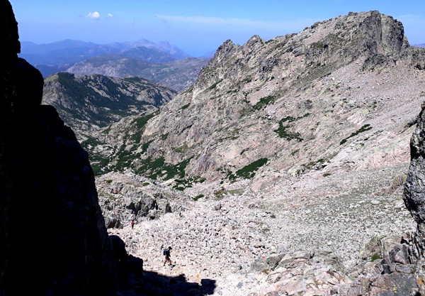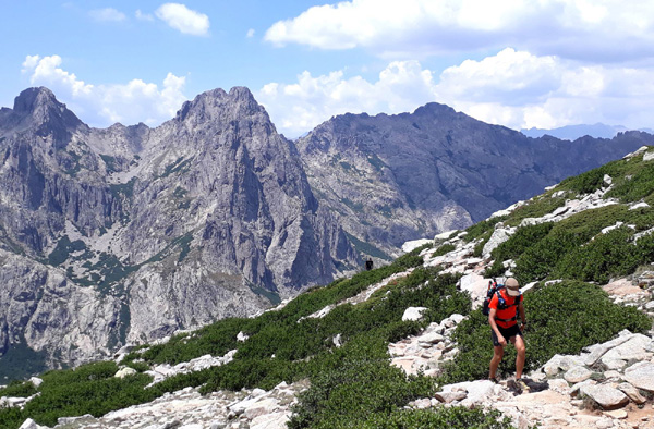 | En marche vers la Pointe de Eboulis (2607 m)... En haut à gauche de la photo : le Mont Cinto (2706 m), point culminant de la Corse |
