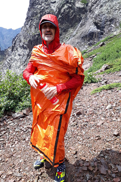 | Surpris en pleine ascension par un violent orage et un déluge de grêle, nous trouverons un abri de fortune derrière un bloc de pierre. 15 minutes interminables, la foudre à moins de 50 m, hypothermie générale malgré nos couvertures de survie... et aucune autre solution que d'attendre que les éléments s'apaisent. La météo des montagnes n'avait pas prévu cet épisode aussi soudain qu'isolé. |