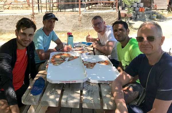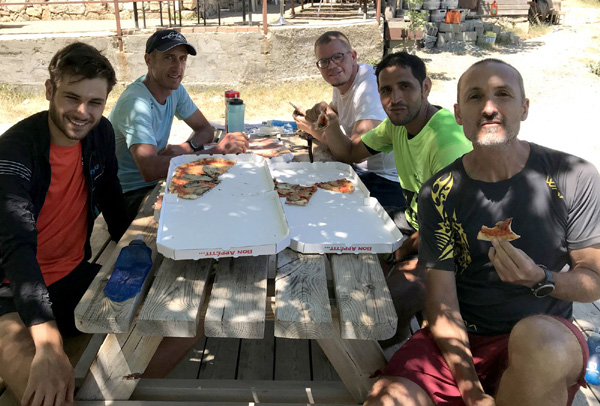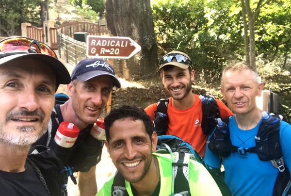 | Jeudi 4 juillet, 6h30 : départ de Castel Di Vergio, le Club des 5 au complet ! De gauche à droite : Laurent, M'Hamed, Nico, moi et Antoine |