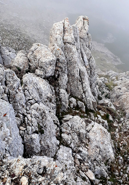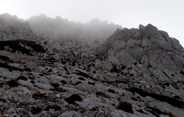 | Descente abrupte et périlleuse (pierriers) L'avantage de l'épais brouillard est qu'il permet de ne pas voir le danger... |
