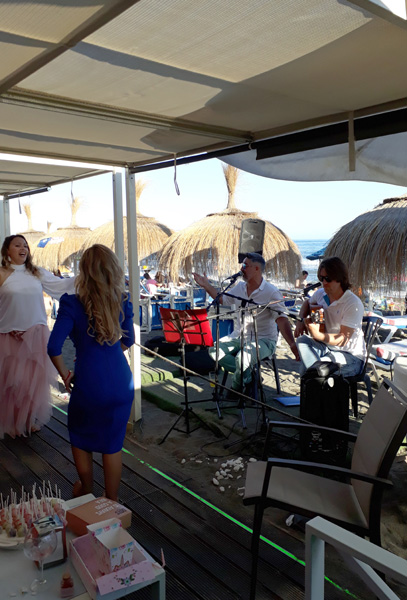 | Dimanche 12 mai, Chiringuito Marina Playa, Rincón de la Victoria Tour de table, de gauche à droite : Marie, Jean-Pierre, Isabelle, Sébastien, Ferdinand, Lucille, Maé, Firinde, Rebecca, Lydia et Thibaut. Jorge prend la photo. |