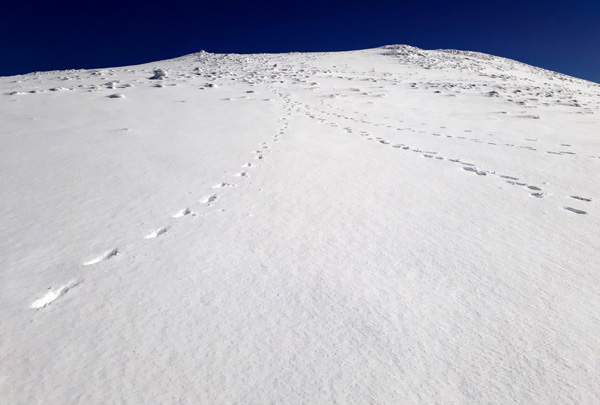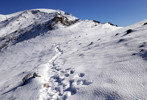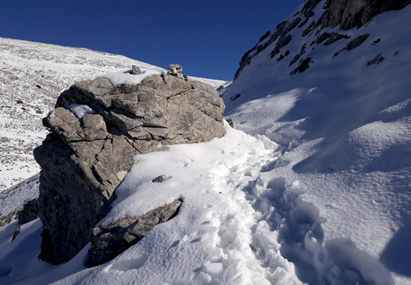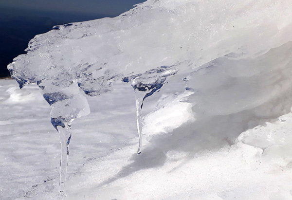 | Crampons indispensables dans la première partie verglacée de la descente... |