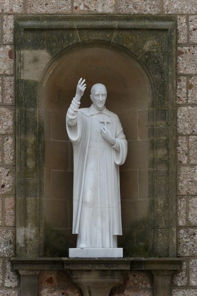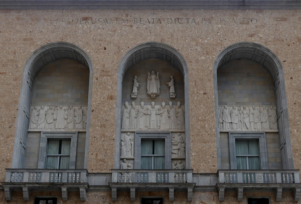 | L'autel est fait d'un bloc de pierre de 8 tonnes et repose sur une dalle provenant de l'ancien autel de la basilique. |