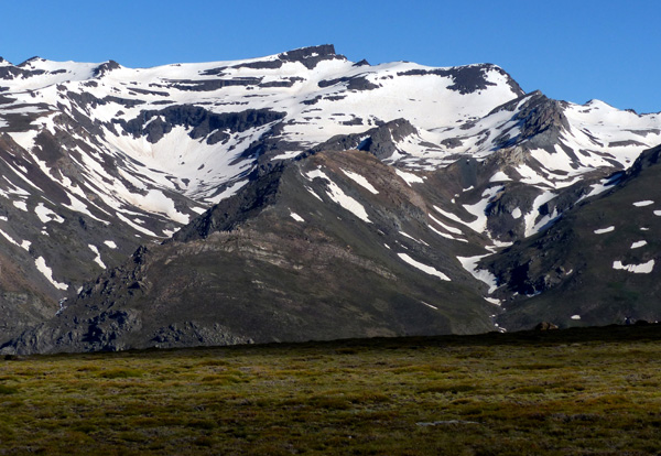 | Pic Veleta (3396 m), facilement identifiable par sa forme trapézoïdale |
