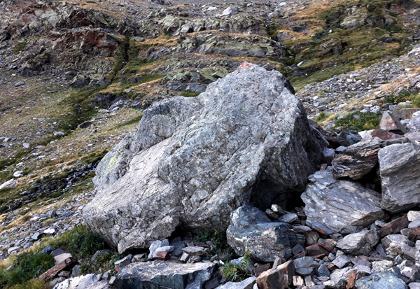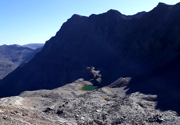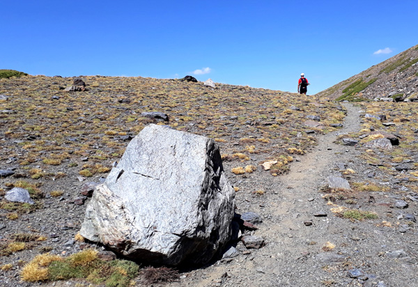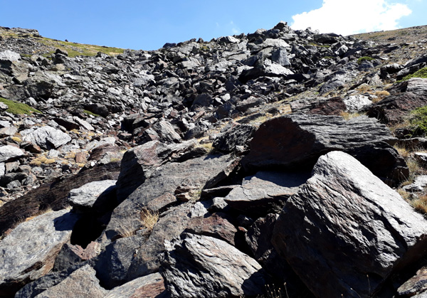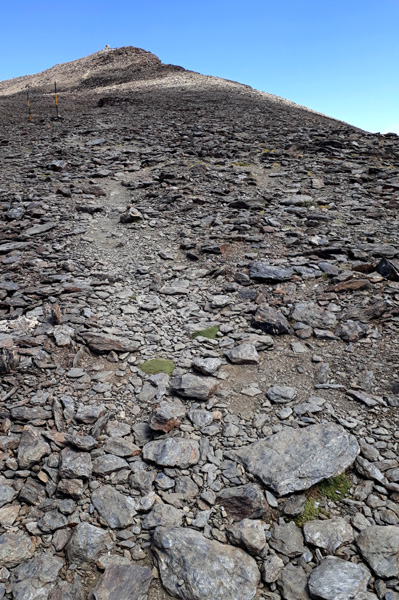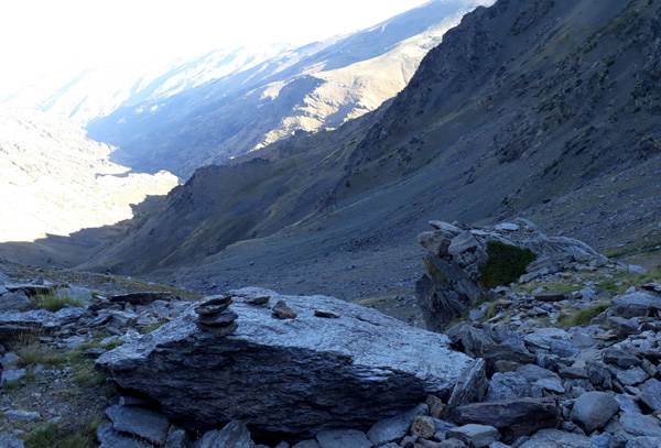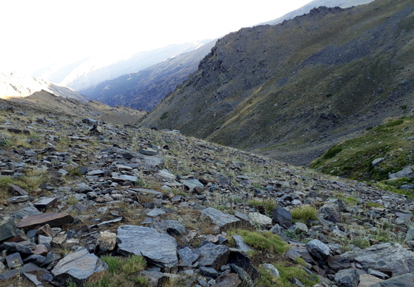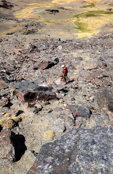 | Il est temps d'entamer la descente par un itinéraire aussi peu fréquenté que pierreux et chaotique... |
