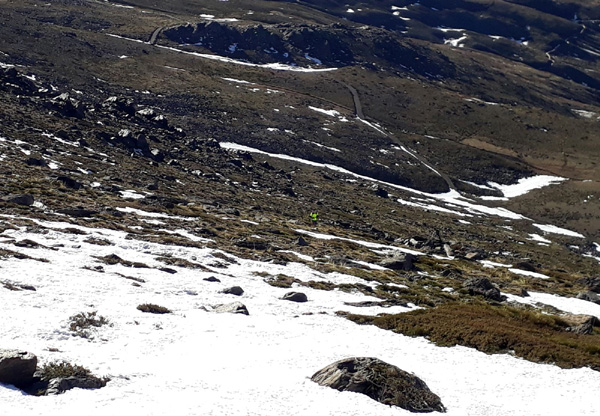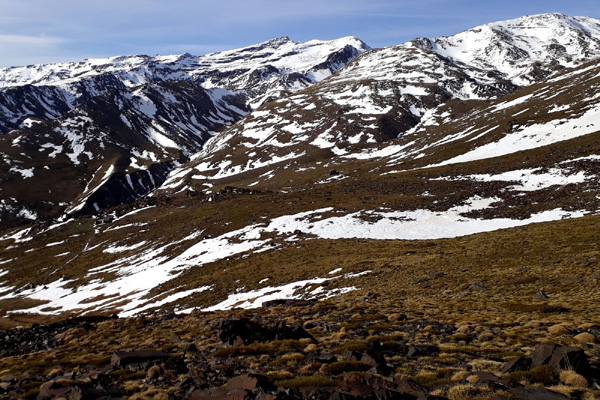 | Pic Veleta (3396 m) en arrière-plan, facilement reconnaissable à sa forme triangulaire |