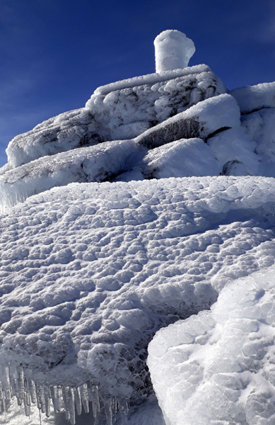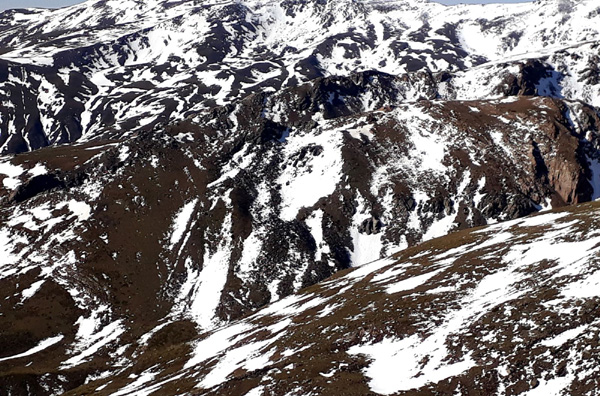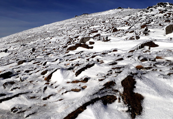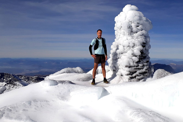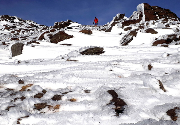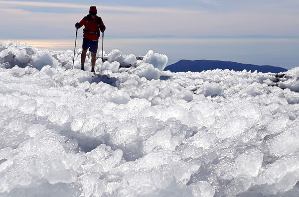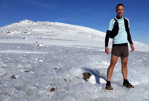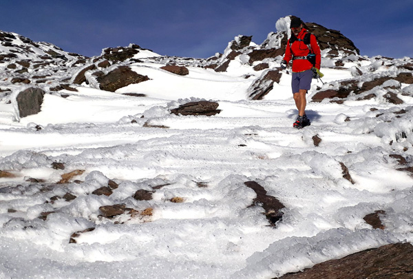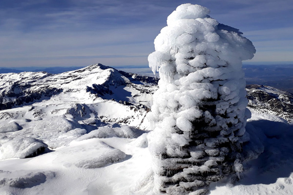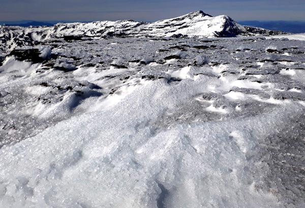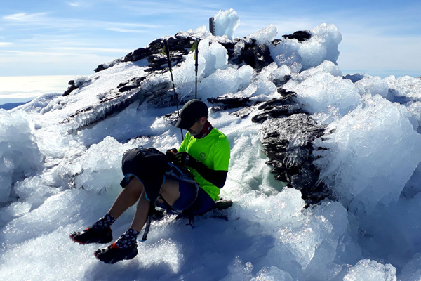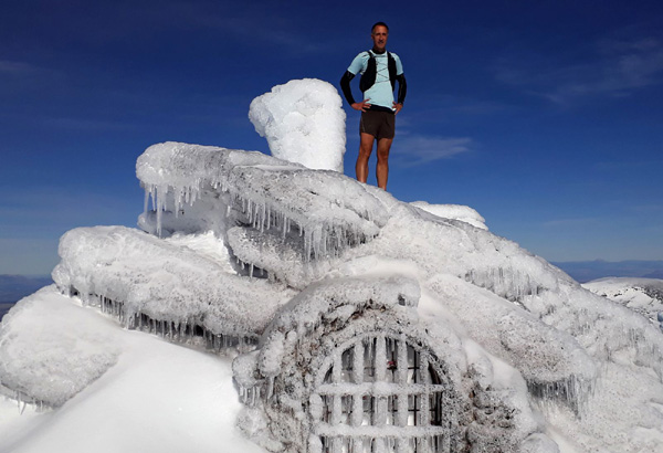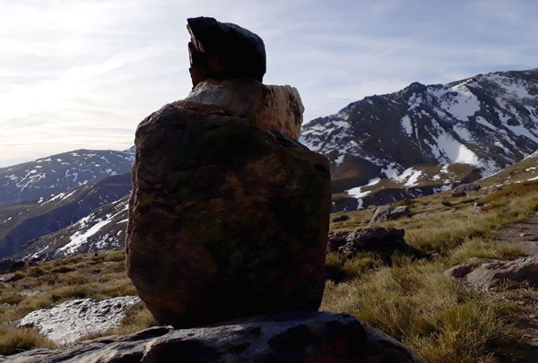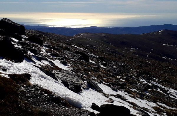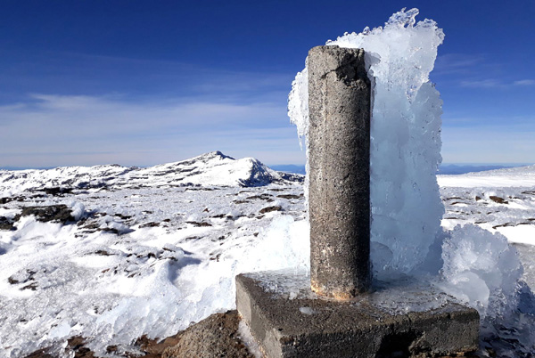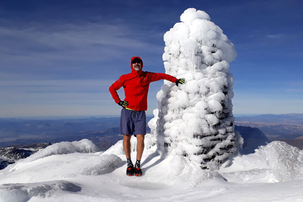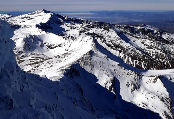 | Pic Mulhacén (3478 m), -4ºC bien que la température ressentie soit nettement supérieure sous les rayons du soleil. La demi-heure que nous passerons au sommet sera magique. Un calme absolu dans une ambiance cotonneuse avec une vue imprenable sur toute la Sierra Nevada, la Méditerranée et la côte marocaine. Le toit de la péninsule ibérique, mirador grand cru en ce jour béni par Sarruma, Dieu des montagnes. |