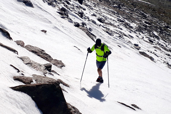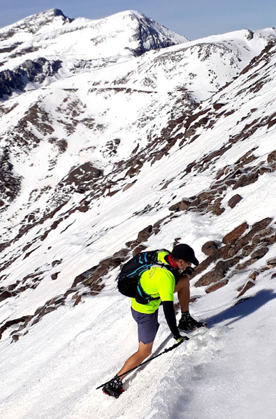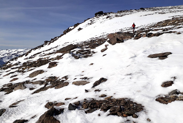| Suivant la recommandation de Rafa, nous grimperons au sommet par la face sud, itinéraire le plus direct, non référencé car particulièrement incliné. En effet, une pente de près de 30% sépare le refuge de Poqueira (2500 m) du Pic Mulhacén II ou "Faux Mulhacén" (3360 m). 860 m de dénivelé positif à gravir en moins de 3 km avec 30% d'oxygène en moins ! |