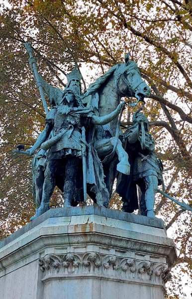 | Charlemagne et ses Leudes, statue située sur le parvis Notre-Dame, réalisée en 1878. Oeuvre des frères sculpteurs français Charles Rochet et Louis Rochet et de la fonderie Thiébaut Frères. Leude : sous les Mérovingiens, homme riche et puissant, lié par serment au roi. |