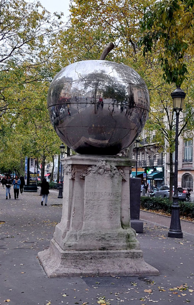 | La Quatrième Pomme, oeuvre du plasticien français Franck Scurti située boulevard de Clichy. Sculpture représentant une pomme monumentale en acier, inaugurée en 2011, en hommage au philosophe Charles Fourier. |