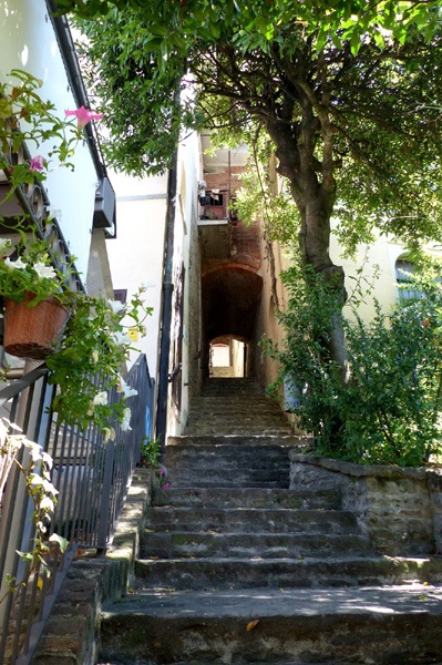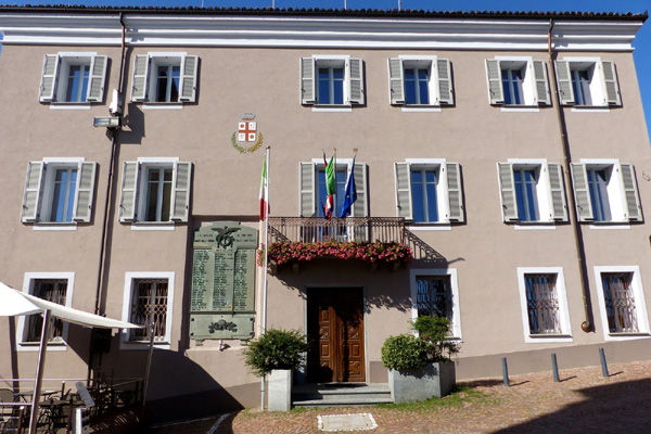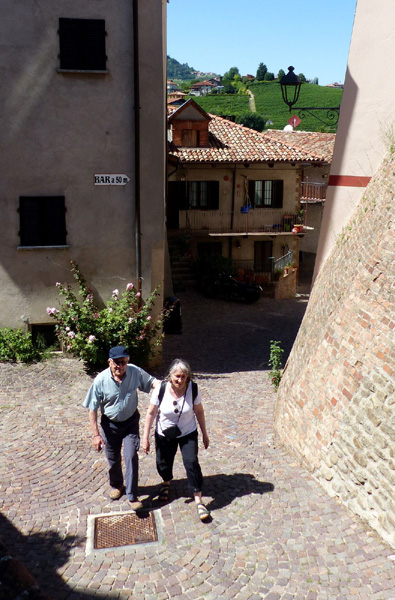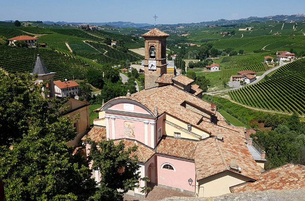 | La Morra représente l'image classique des villes et villages de la région : façades colorées, tuiles rouges, cheminées en brique du pays et vignobles à perte de vue. |