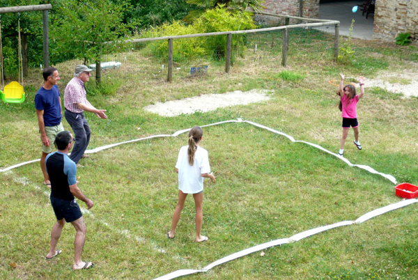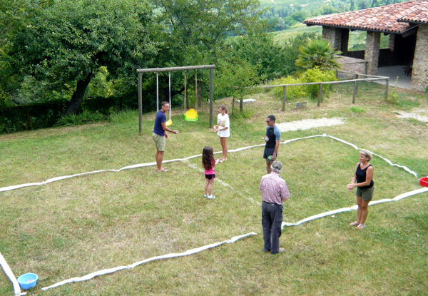 | Principe du lancer de bombe à eau : Les participants forment 2 rangées qui se font face. Chaque participant d'un côté lance un ballon rempli d'eau à son partenaire d'en face. Toute équipe qui éclate la bombe à eau est éliminée. Les participants des autres équipes reculent d'un pas, histoire d'augmenter la difficulté du jeu à chaque tour et jusqu'à ce qu'il ne reste plus qu'une équipe. La variante avec un oeuf cru est également sympathique... |