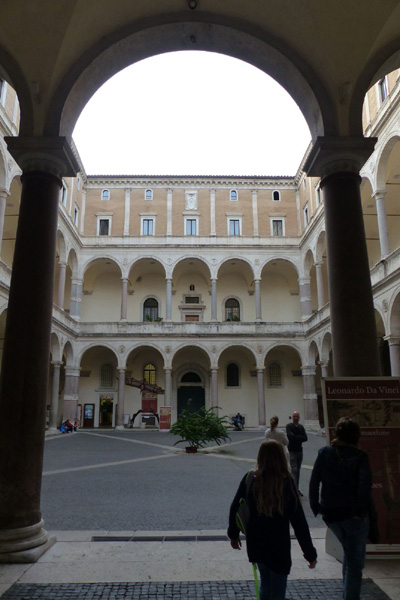 | Exposition "Leonardo Da Vinci, Le grandi macchine" au Palais de la Chancellerie Construit à l'initiative du cardinal Riario, le palais est attribué à Andrea Bregno, et à Bramante pour la cour intérieure. Il date de la fin du 15ème siècle. Sa construction a eu lieu de 1485 à 1517. Le palais abrite depuis 1870 les bureaux de la chancellerie apostolique ainsi que ceux de l'Académie pontificale romaine d'archéologie. Appartenant au Vatican, il bénéficie de l'extraterritorialité. |