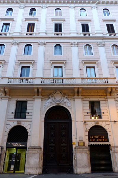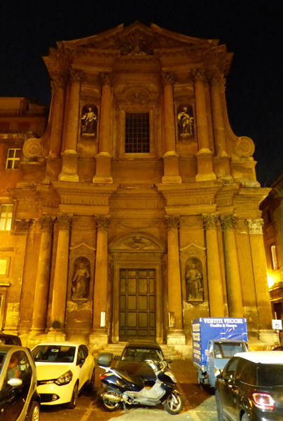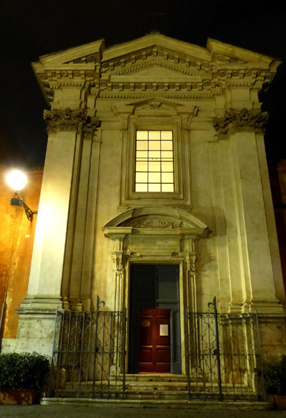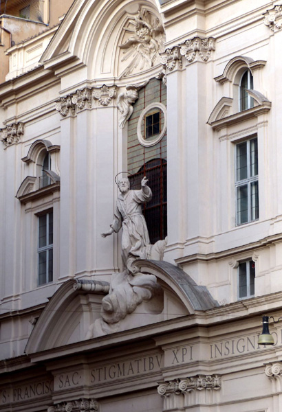 | Eglise Santissime Stimmate di San Francesco ou église des Très-Saints-Stigmates-de-Saint-François, dédiée à François d'Assise. La première église fut construite au 13ème siècle sous le nom de Santi Quaranta Martiri de Calcarario. L'édifice est alloué en 1597 à l'archiconfrérie des Stigmates Sacrés de Saint-François et totalement reconstruite de 1708 à 1721 sous le pontificat de Clément XI sur le projet de l'architecte Giovanni Battista Contini. Elle prend alors son nom actuel. |