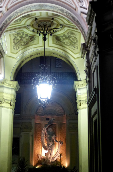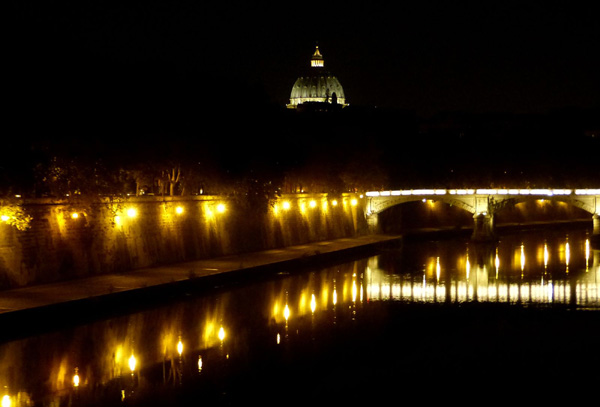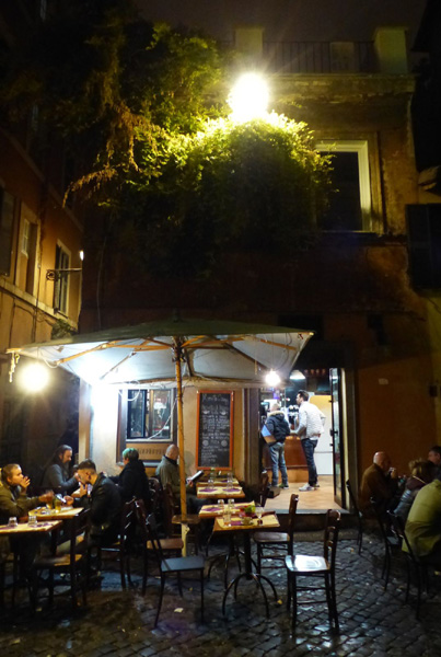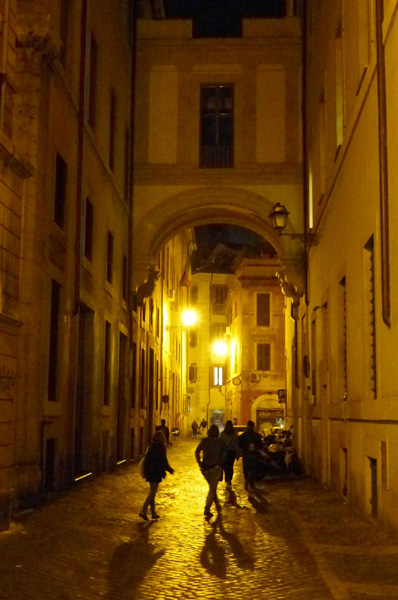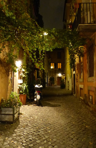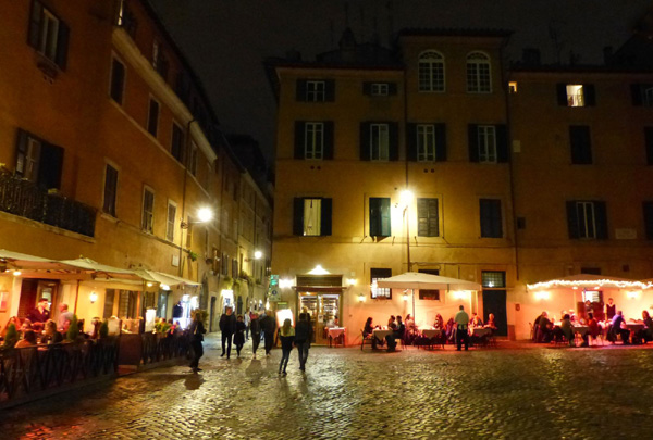 | En arrière-plan dans l'obscurité, la basilique Sainte-Marie-du-Trastevere |