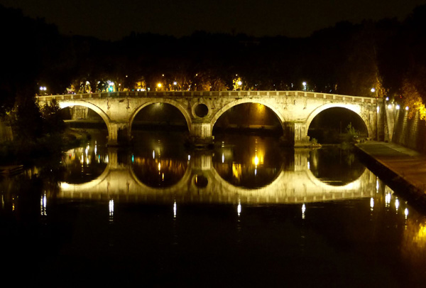 | Pont Sisto avec la coupole de la basilique Saint-Pierre en arrière-plan. Le pont enjambe le Tibre, reliant les districts de Regola et du Trastevere. Il fut construit de 1473 à 1479, sous le pontificat du pape Sixte IV, auquel il doit son nom. |