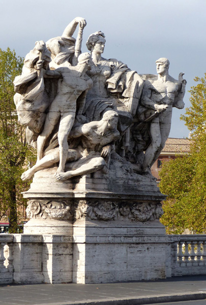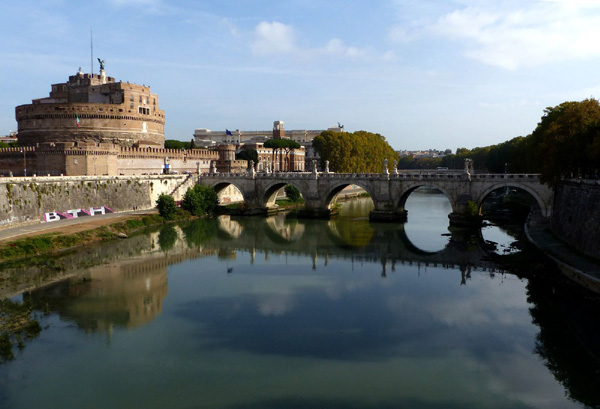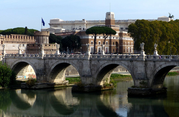 | Pont Sant'Angelo ou Saint-Ange qui relie les deux rives du Tibre, construit en 134 sous le règne de l'empereur Hadrien. En arrière-plan à gauche, le château Saint-Ange, énorme tumulus construit en 135 par l'empereur Hadrien pour devenir son mausolée. Par la suite le château sera transformé en palais par le Pape Paul III. En arrière-plan à droite, le Tribunal Judiciaire. |