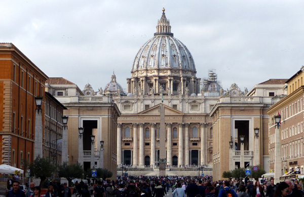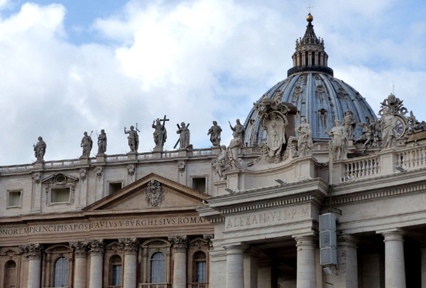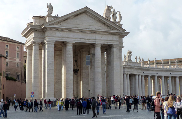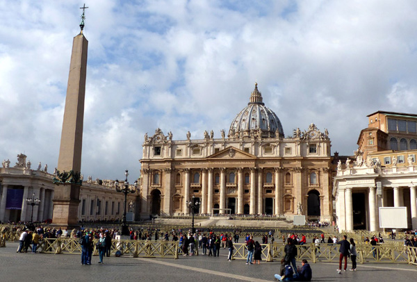 | Basilique et place Saint-Pierre La basilique Saint-Pierre est la plus grande église catholique au monde (capacité supérieure à 60.000 personnes). Inscrite au patrimoine mondial par l'UNESCO, elle est considérée comme la plus grande conception architecturale de son temps et demeure l'un des monuments les plus visités au monde. Sa construction, à l'emplacement de l'ancienne basilique construite sous l'empereur Constantin, commence le 18 avril 1506 et est achevée en 1626. Ses architectes les plus importants sont Bramante, Michel-Ange et Le Bernin. Important lieu de pèlerinage : plus de 150.000 catholiques se rassemblent chaque dimanche lors de l'angélus pontifical. |