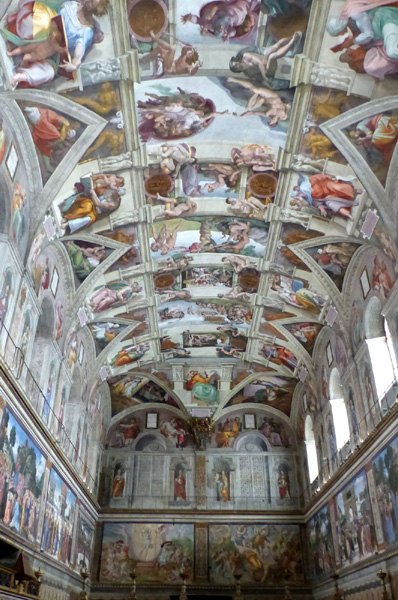 | Chapelle Sixtine, originellement appelée chapelle de Sixte. Depuis le 15ème siècle, les cardinaux s'y réunissent en conclave et élisent le nouveau pape. La chapelle doit son nom au pape Sixte IV, qui la fit bâtir de 1477 à 1483. Le mur du fond comporte l'immense fresque du Jugement dernier, peinte par Michel-Ange. La chapelle doit sa célébrité à son exceptionnelle décoration peinte, réalisée par les plus grands artistes de la Renaissance, parmi lesquels Michel-Ange, Le Pérugin, Sandro Botticelli, Domenico Ghirlandaio, Cosimo Rosselli et Pinturicchio. |