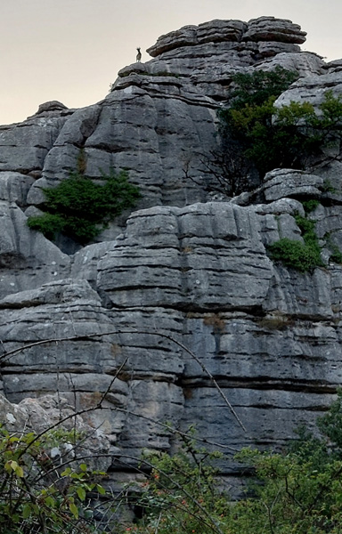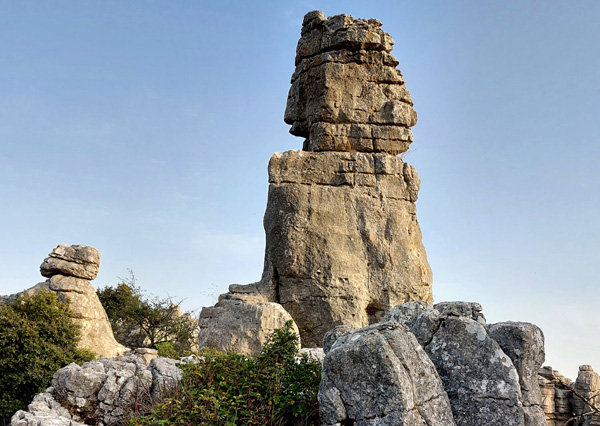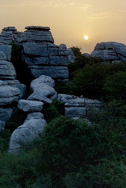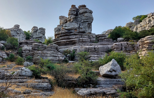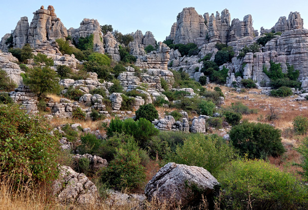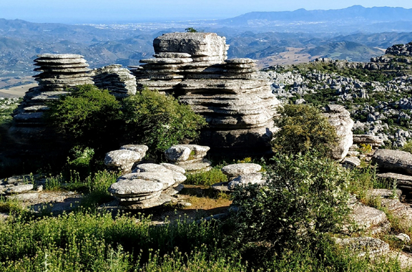 | Le Torcal de Antequera est un espace naturel célèbre pour les formes que l'érosion a donné à ses roches calcaires. Il s'étend sur 20 km² et constitue un bel exemple de paysage karstique en Europe. Ses origines remontent au Jurassique, il y a 150 millions d'années. La zone se trouvait alors sur un long couloir maritime unissant le Golfe de Cadix à Alicante. Les plissements alpins provoquèrent l'émergence des sédiments calcaires déposés au fond de ce bras marin et donnèrent naissance à ces montagnes, dont les sommets prirent souvent une forme arrondie. |