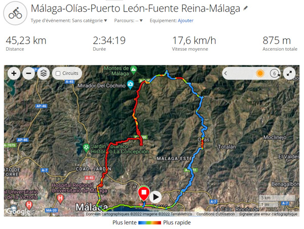 | MÁLAGA - OLÍAS - COL DEL LEÓN (900 M) - FUENTE REINA - MÁLAGA 45,2 KM, 875 M de dénivelé positif / 2022 - ESPAGNE, Andalousie |