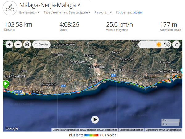 | MÁLAGA - NERJA - MÁLAGA 103,6 KM, 177 M de dénivelé positif / 2023 - ESPAGNE, Andalousie |