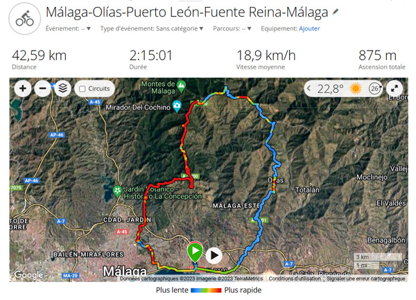 | MÁLAGA - OLÍAS - COL DEL LEÓN (900 M) - FUENTE REINA - MÁLAGA 42,6 KM, 875 M de dénivelé positif / 2023 - ESPAGNE, Andalousie |