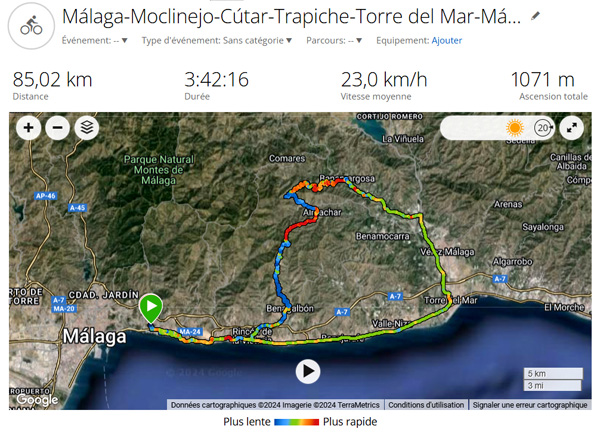 | MÁLAGA - MOCLINEJO - CÚTAR - TRAPICHE - TORRE DEL MAR - MÁLAGA 85,02 KM, 1071 M de dénivelé positif / 2024 - ESPAGNE, Andalousie |