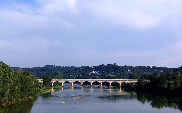| Le pont-canal d'Agen, bâti entre 1839 et 1847 sous la direction de l'architecte Jean-Baptiste de Baudre, 539 m de long et 12,50 m de large, permet de faire passer la navigation au-dessus de la Garonne. |