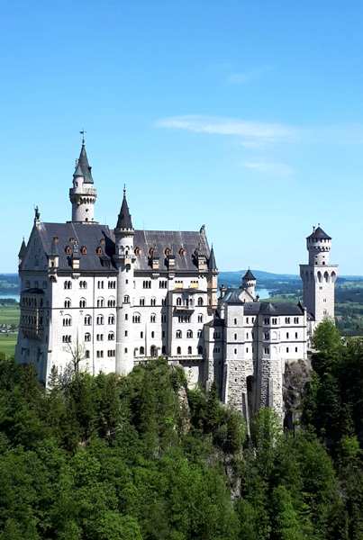 | Le château de Neuschwanstein se dresse sur un éperon rocheux haut de 200 m près de Füssen dans l'Allgäu. Le roi Louis II de Bavière l'a fait construire au 19ème siècle. C'est aujourd'hui le château le plus célèbre d'Allemagne (plus d'1 million de visiteurs par an). |
