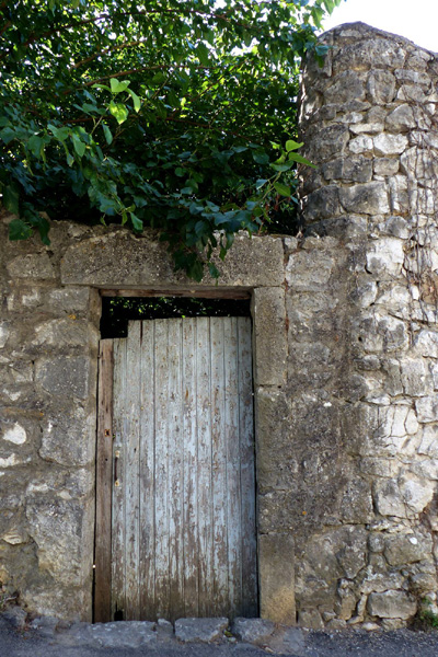 | Façade occidentale de l'église qui se présente comme un mur nu percé d'une simple fenêtre, prolongé par le clocher-arcade dont les trois baies sont dépourvues de cloches depuis que celles-ci ont été transportées dans la nouvelle église du village |