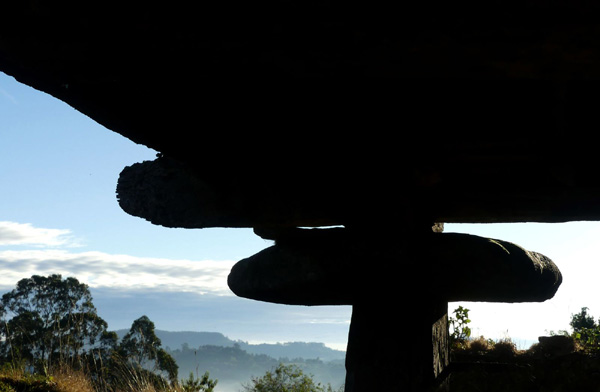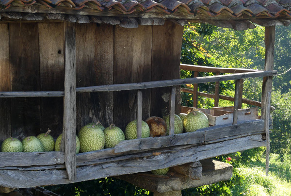 | "Hórreo", grenier typique du nord-ouest de la péninsule Ibérique (principalement Galice et Asturies en Espagne, et région Nord au Portugal), construit en bois et pierre, et élevé sur des piliers terminés par des supports plats afin d'en interdire l'accès aux rongeurs. |