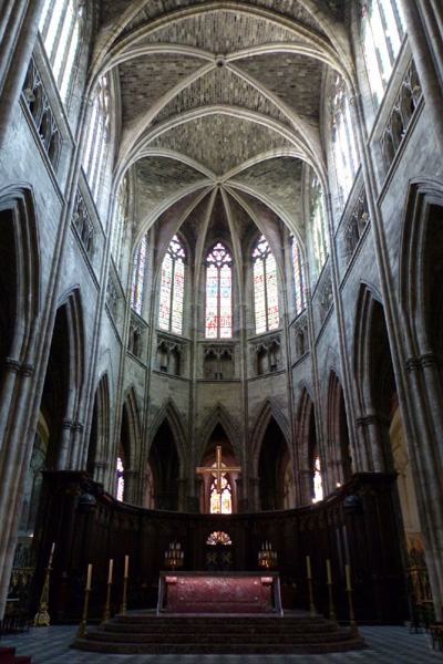 | Le choeur se caractérise par ses vitraux et sa hauteur (29 m) |
