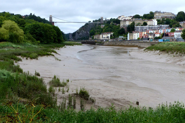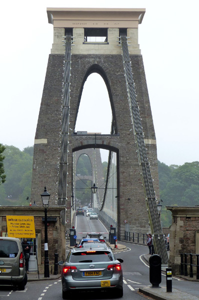 | Pont suspendu de Clifton, symbole de Bristol, conçu par Isambard Kingdom Brunel dans un site sauvage encaissé et soumis aux marées. Le pont enjambe la vallée de l'Avon et relie Clifton, quartier de Bristol, à Leigh Woods. Longueur totale : 412 m, hauteur au-dessus des hautes eaux : 74 m |