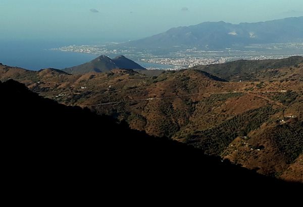 | Village de El Borge (240 m) et La Maroma (2068 m) en arrière-plan |