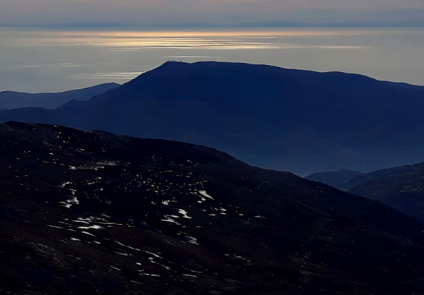 | Pic Mulhacén (3478 m), -4ºC bien que la température ressentie soit nettement supérieure sous les rayons du soleil. La demi-heure que nous passerons au sommet sera magique. Un calme absolu dans une ambiance cotonneuse avec une vue imprenable sur toute la Sierra Nevada, la Méditerranée et la côte marocaine. Le toit de la péninsule ibérique, mirador grand cru en ce jour béni par Sarruma, Dieu des montagnes. |